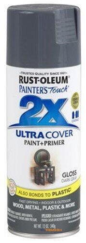 Rust-Oleum painter’s touch ultra cover 2x . Gloss dark gray general purpose spray paint delivers twice the coverage as other competitive brands. Double cover technology provides ultimate hiding power and is a paint and primer in one allowing projects to be completed quickly. A great value.